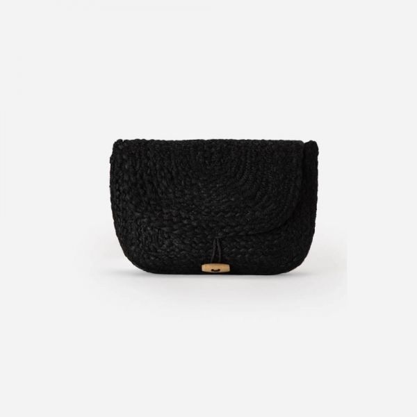 POCHETE DE PALHA feita em palha trançada. Pochete feminina com passantes na parte posterior e fechamento frontal por encaixe e detalhe em madeira. Acompanha cinto com fechamento por fivela com regulagem.